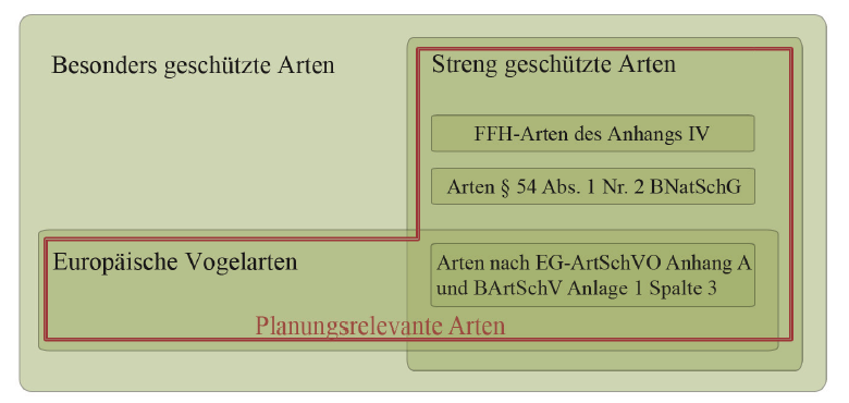 Den Umfang des zu betrachtenden Artenspektrums im Kontext einer speziellen artenschutzrechtlichen Prüfung definiert § 44 Abs. 5 BNatSchG als sogenannte planungsrelevante Arten. Diese umfassen besonders geschützten Arten, zu welchen alle europäischen Vogelarten zählen und streng geschützte Arten. Unter den Teilbereich der streng geschützten Arten fallen alle Arten des Anhang IV der FFH-RL sowie Arten des § 54 Abs. 1 Nr. 2 BNatSchG und Arten nach EG-ArtschVO Anhang A und BArtSchV Anlage 1 Spalte 3.